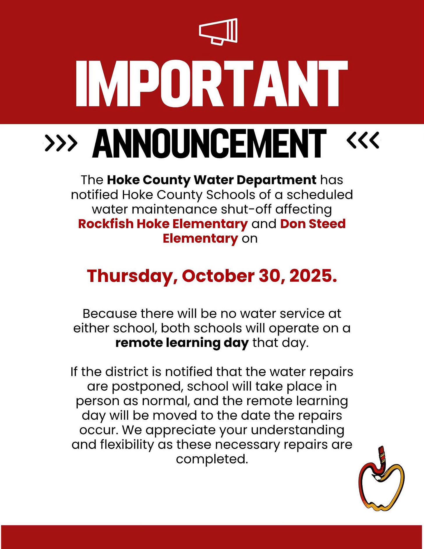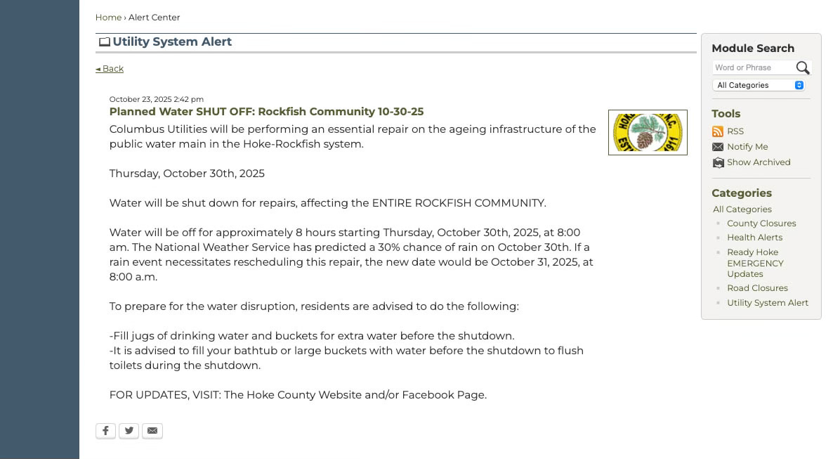 On Oct. 30 the water supply in the entire Rockfish area will be shut down, again, beginning at 8 a.m. Crews anticipate they will be able to remedy another section of the area’s chronically ignored infrastructure in 8 hours, another familiar refrain. Rockfish Hoke Elementary and Don Steed Elementary schools plan on conducting a remote learning day on Oct. 30 unless construction is delayed due to—ironically—wet conditions.